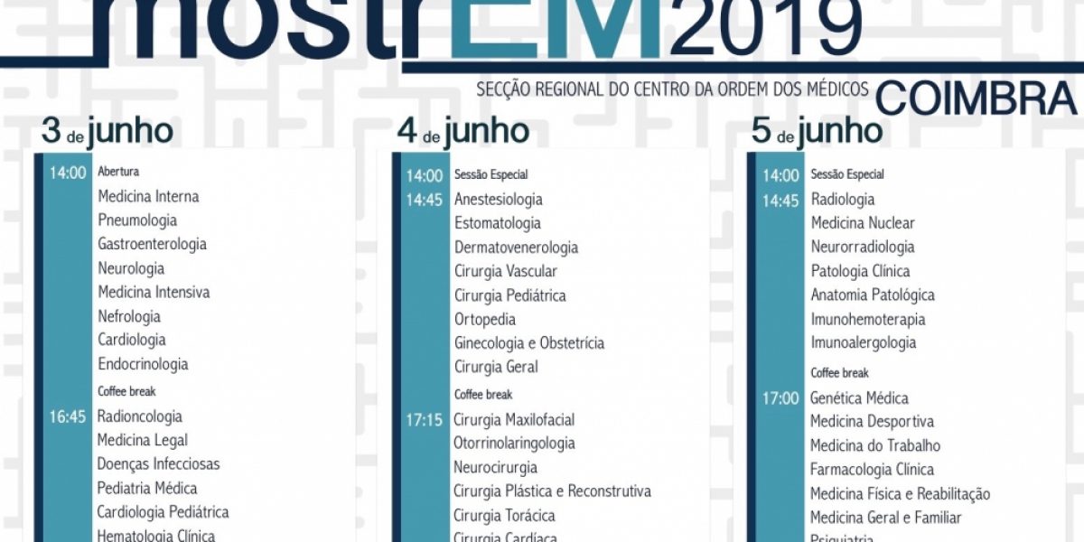 A Mostra de Especialidades Médicas – mostrEM – vai decorrer entre 3, 4 e 5 junho, em Coimbra, na Secção Regional do Centro da Ordem dos Médicos. Trata-se de uma iniciativa do Conselho Nacional do Médico Interno e dos Colégios da Especialidade da Ordem dos Médicos que já vai na XIV edição.