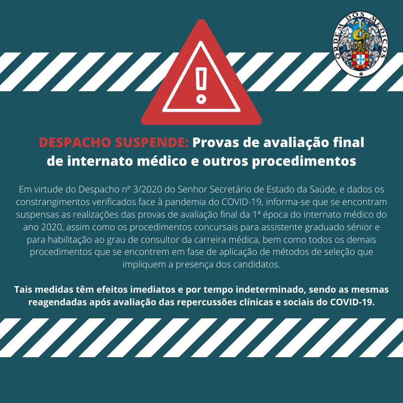 Encontram-se suspensas as realizações das provas de avaliação final da 1ª época do internato médico do ano 2020, assim como os procedimentos concursais para assistente graduado sénior e para habilitação ao grau de consultor da carreira médica, bem como todos os demais procedimentos que se encontrem em fase de aplicação de métodos de seleção que impliquem a presença dos candidatos.