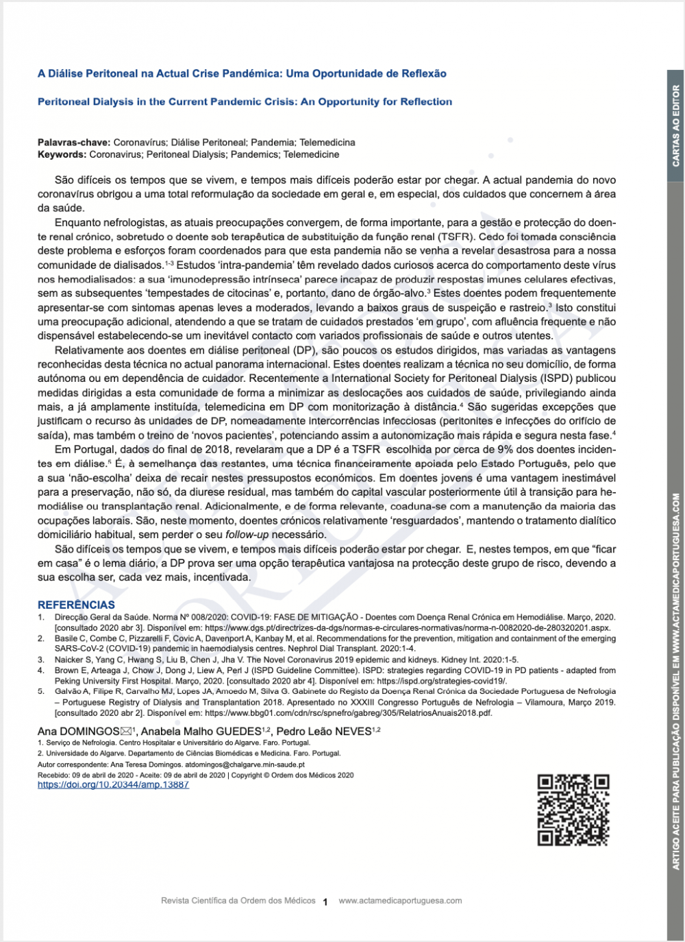 A Diálise Peritoneal na Actual Crise Pandémica: Uma Oportunidade de Reflexão Peritoneal Dialysis in the Current Pandemic Crisis: An Opportunity for Reflection
