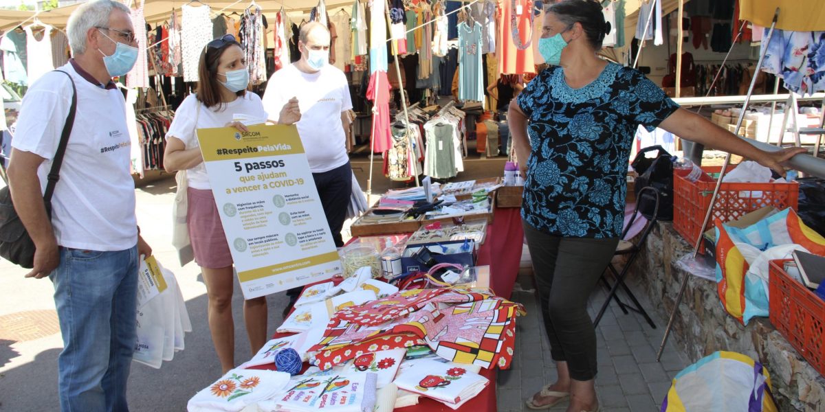 A equipa de voluntários partilhou com a população as recomendações da Direção-Geral da Saúde (DGS) relativas às boas práticas de saúde pública e à adoção de comportamentos seguros para combater a Covid-19, neste caso em particular no contexto de férias e de rotinas do dia-a-dia quanto aos comportamentos seguros a ter no momento das compras em feiras e mercados.