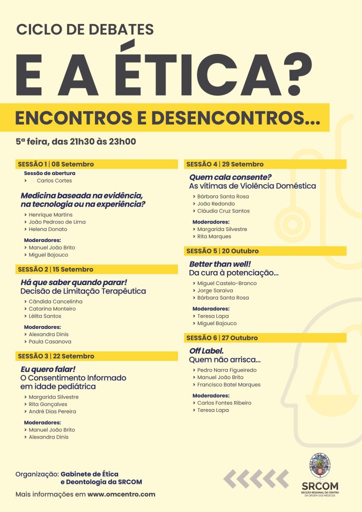 A Secção Regional do Centro da Ordem dos Médicos, através do seu Gabinete de Ética e Deontologia, desenvolverá o ciclo de debates, na modalidade presencial, com o tema “E a Ética? Encontros e Desencontros…“. Ao longo de seis sessões, todas as quintas-feiras, das 21h30 às 23h00, um tema diferente será desenvolvido, contando com a perspetiva e reflexão de ilustres palestrantes que irão fazer uma reflexão ética sobre várias questões clínicas, atuais e emergentes.