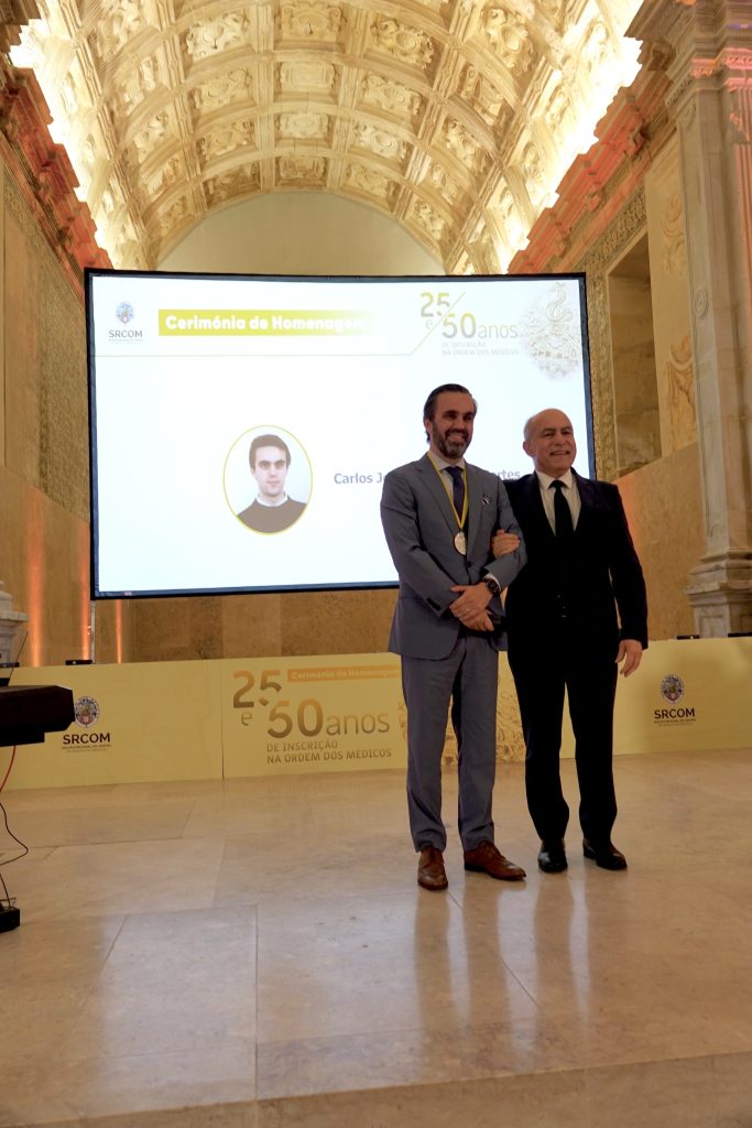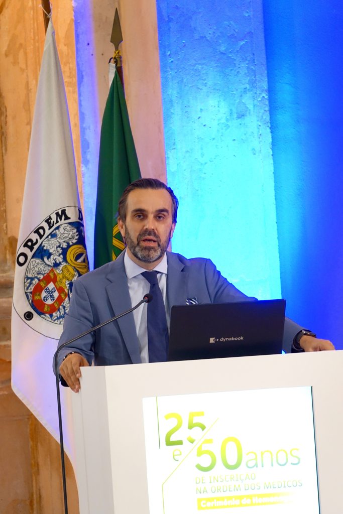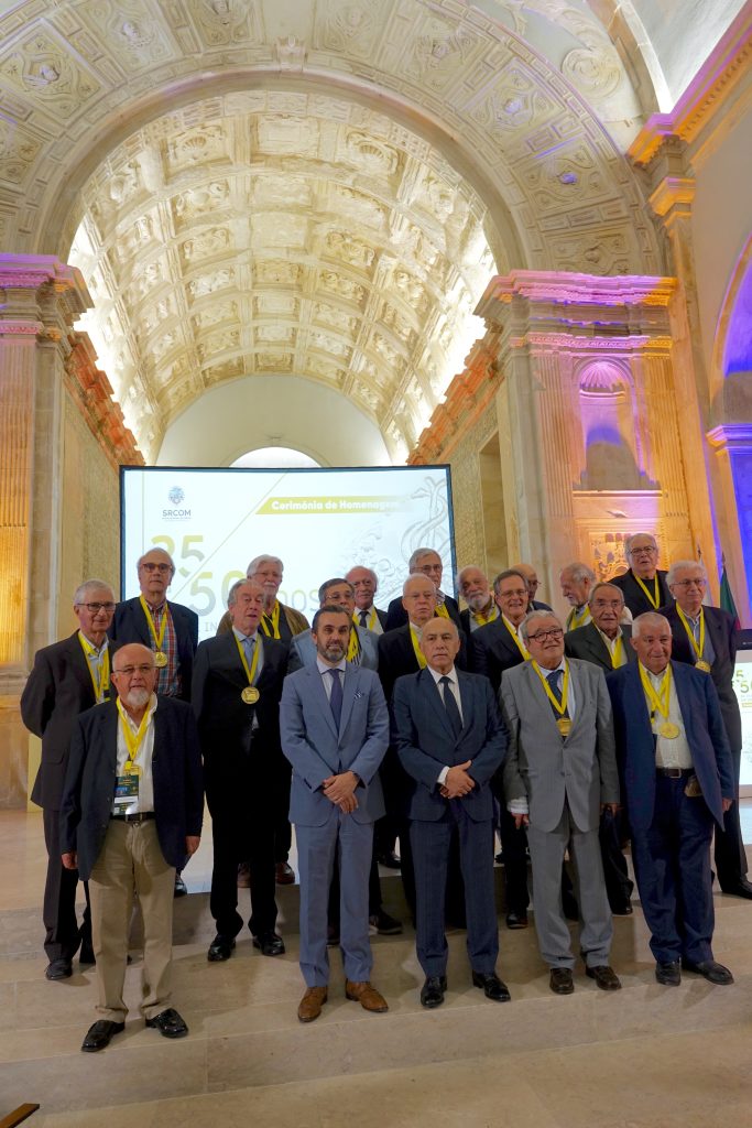 “É a primeira vez que estou numa cerimónia da SRCOM em que eu não sou o presidente”, começou por frisar Carlos Cortes, arrancando largos sorrisos aos presentes, agradecendo desde logo ao atual presidente, Manuel Teixeira Veríssimo, “o magnífico trabalho que tem desenvolvido e, sobretudo, a sua postura de colaboração e de lealdade com a direção nacional”. Intervindo de improviso, o Bastonário da Ordem dos Médicos, um dos homenageados com a medalha que assinala os 25 anos de inscrição, agradeceu também as palavras das jovens estudantes e daquilo que esperam “desta maravilhosa profissão”. Carlos Cortes, nesta intervenção inicial, não deixou de se dirigir aos “mestres, amigos, colegas” que irão receber as medalhas dos 50 anos bem como os colegas que, com ele, perfazem 25 anos de inscrição na OM. “É verdade que os médicos, ao longo da história, tiveram sempre um papel muito importante, quer na prestação dos cuidados de saúde, quer um papel social absolutamente fundamental no desenvolvimento do nosso País”, destacou, elencando momentos marcantes da nossa História, quer na ditadura quando “de forma destemida e muito responsável” publicaram o Relatório das Carreiras Médicas, quer em 1979 na criação do Serviço Nacional de Saúde. “O Dr. António Arnaut reconhecia que tinham sido os médicos a ter tido a ideia e a edificar o SNS”, sublinhou. Carlos Cortes lembrou ainda a importância capital de quem esteve, muitos dos quais ali presentes, no Serviço Médico à Periferia, nas ilhas e no resto do País, “servindo as populações, muitos nunca tinham visto um médico na sua vida”. E acrescentou outro episódio marcante mais recente que também foi referido pelas estudantes de medicina: a pandemia da COVID-19. “Tivemos, novamente, uma prova de coragem, uma prova daquilo que é a Medicina hipocrática”, assumiu. Sobre dificuldades mais recentes, o Bastonário da Ordem dos Médicos aludiu à negociação em volta da Lei-Quadro das Ordens Profissionais, afirmando-se esperançado, entre outros preceitos legais, na publicação do Ato Médico. “Foi-nos prometida pelo atual ministro da Saúde que a Lei do Ato Médico ficaria integrada no novo Estatuto da Ordem dos Médicos”, afirmando ainda que, a seu ver, que este será um passo muito importante no desenvolvimento da Medicina. A finalizar, o Bastonário asseverou que, em qualquer circunstância, “é necessário estarmos sempre atentos, na defesa de uma formação médica de qualidade, na defesa de uma medicina qualificada. Sei muito bem qual o papel da Ordem dos Médicos. Nunca deixarei que as competências próprias – técnicas, formativas e científicas – possam ser ocultadas e retiradas.”.