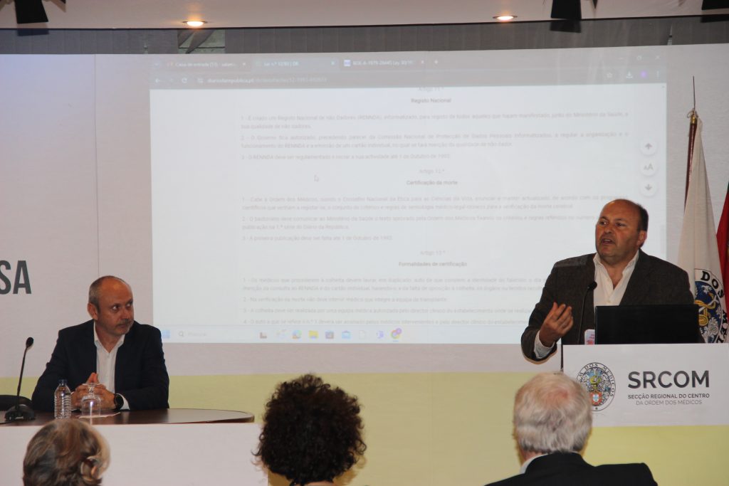 André Dias Pereira, Professor da Faculdade de Direito da Universidade de Coimbra, presidente do Centro de Direito Biomédico da Universidade de Coimbra e vice-presidente do Conselho Nacional de Ética e Ciências da Vida, que abordou os aspetos legais, começou a abordar o conceito de morte, especificamente de morte cerebral, e a respetiva certificação.