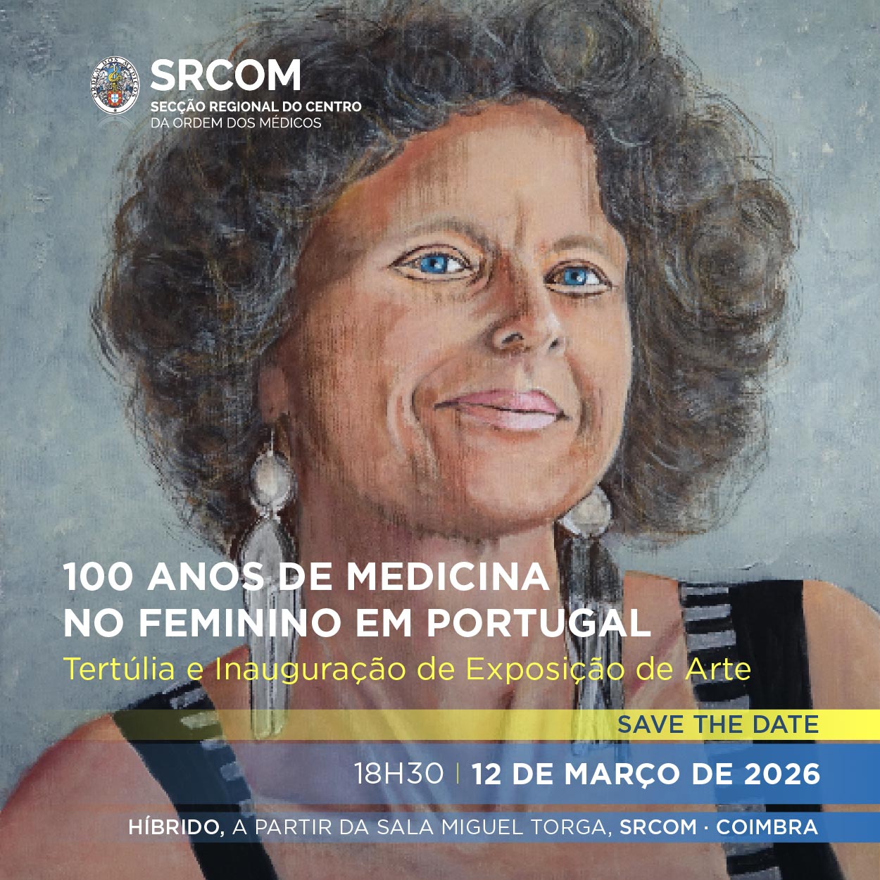A Ordem dos Médicos – Secção Regional do Centro assinala os 𝟏𝟎𝟎 𝐚𝐧𝐨𝐬 𝐝𝐞 𝐌𝐞𝐝𝐢𝐜𝐢𝐧𝐚 𝐧𝐨 𝐟𝐞𝐦𝐢𝐧𝐢𝐧𝐨 𝐞𝐦 𝐏𝐨𝐫𝐭𝐮𝐠𝐚𝐥 com uma tertúlia e inauguração de exposição de arte que homenageia o contributo das médicas portuguesas ao longo do último século. Marque na sua agenda: 12 de março de 2026 18h30 Sala Miguel Torga – SRCOM, … Continue a ler Exposição e tertúlia: “100 anos de Medicina no feminino em Portugal”