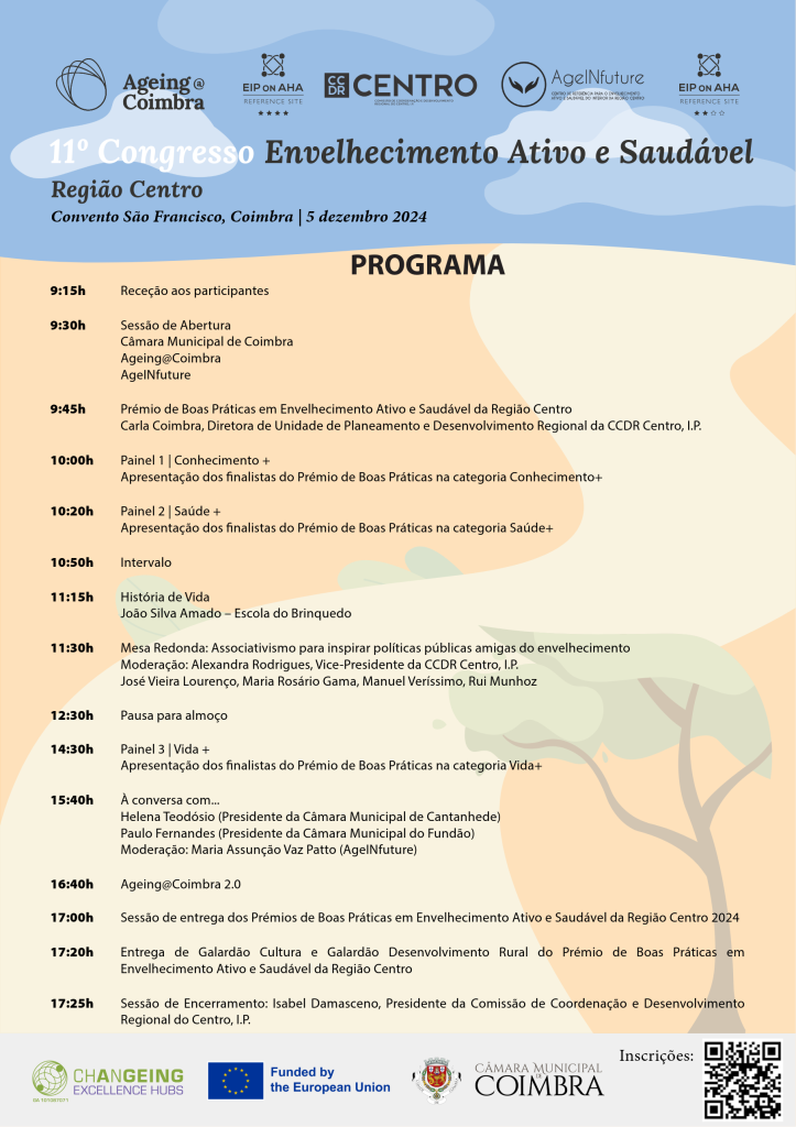 O 11º Congresso em Envelhecimento Ativo e Saudável da Região Centro, iniciativa conjunta dos Consórcios Ageing@Coimbra e AgeINfuture, com o apoio institucional da Comissão de Coordenação e Desenvolvimento Regional do Centro, irá realizar-se no dia 5 de dezembro, no Convento São Francisco em Coimbra.