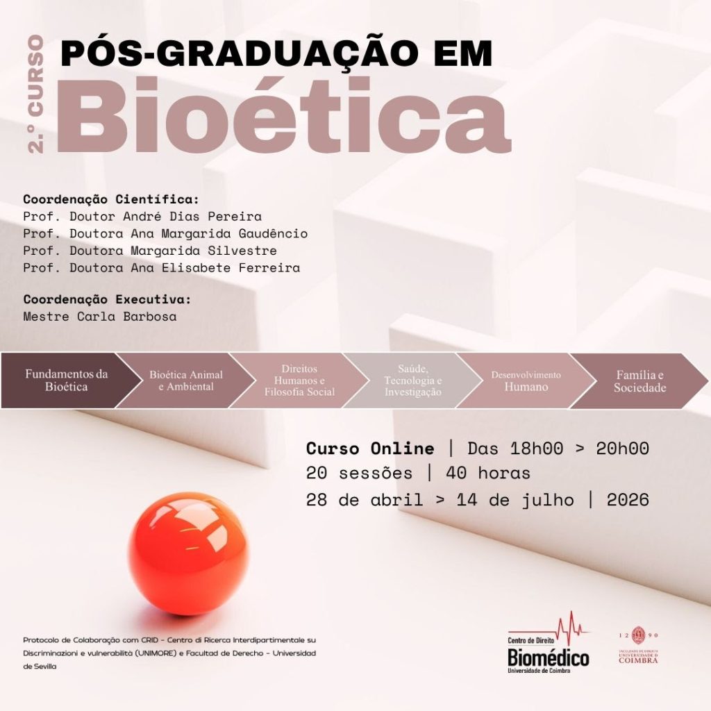 O 2.º Curso de Pós-Graduação em Bioética irá decorrer de 28 de Abril a 14 de Julho de 2026, no formato online, das 18h00 às 20h00.