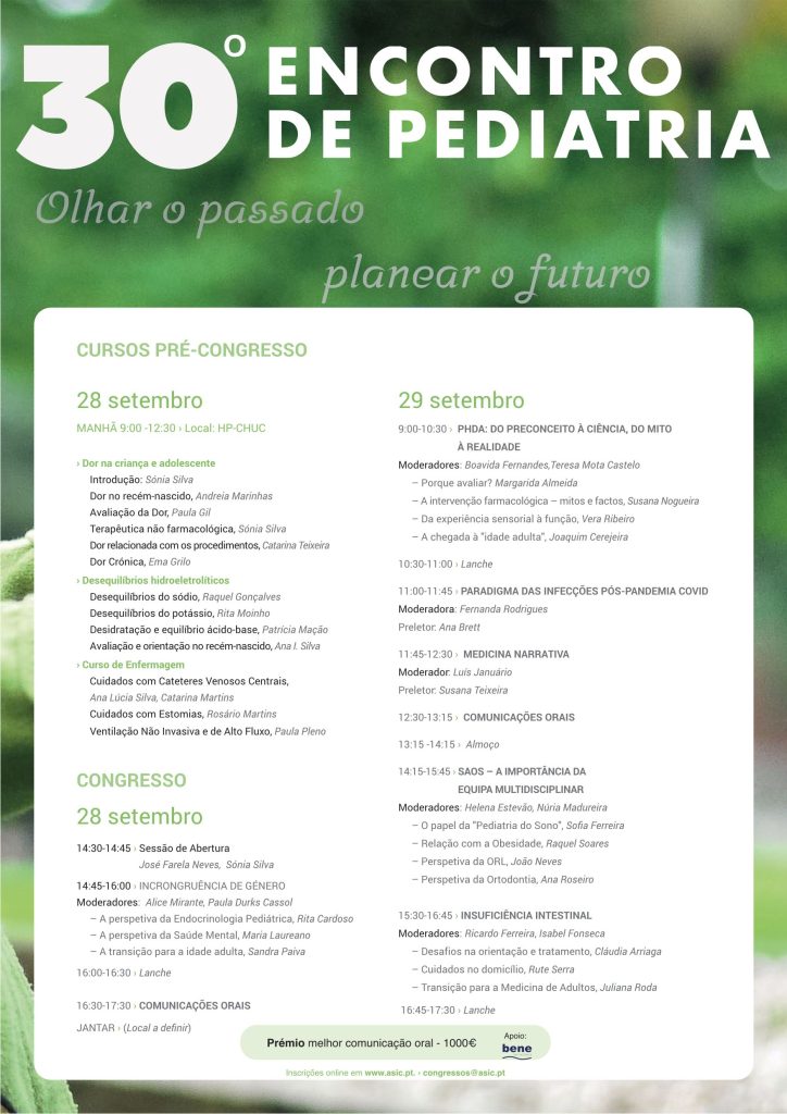 Nos dias 28 e 29 de setembro de 2023, terá lugar o 30º Encontro de Pediatria do Hospital Pediátrico, no IParque – Parque para a Inovação em Ciência, Tecnologia e Saúde, Coimbra. O evento, organizado pela Associação de Saúde Infantil de Coimbra (ASIC), tem como tema “Olhar o passado, planear o futuro”. As inscrições poderão ser feitas online em https://www.asic.pt/index.php/inscricoes-online/30-encontro-de-pediatria