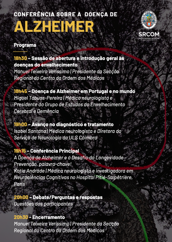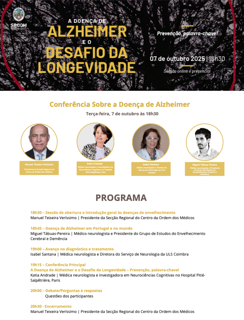 A Secção Regional do Centro da Ordem dos Médicos acolhe a conferência “A Doença de Alzheimer e o Desafio da Longevidade – Prevenção, palavra-chave!”, no dia 7 de outubro, terça-feira, numa sessão aberta ao grande público e que decorrerá em formato presencial e online.