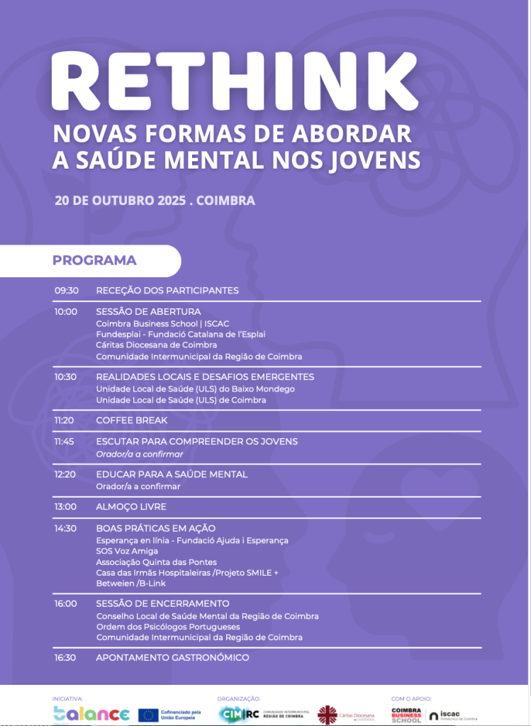Em Portugal, 2 em cada 5 jovens apresentam sintomas depressivos, de acordo com dados recentes da Escola Superior de Enfermagem de Coimbra. É perante esta realidade que a Comunidade Intermunicipal da Região de Coimbra, em colaboração com outros parceiros, organiza a conferência RETHINK: Novas formas de abordar a saúde mental nos jovens, que terá lugar no próximo dia 20 de outubro de 2025, na Coimbra Business School | ISCAC, em Coimbra. Este encontro, de acordo com a organização, constitui um espaço de reflexão, partilha e mobilização coletiva, reunindo especialistas, instituições e projetos nacionais e internacionais para discutir estratégias inovadoras, boas práticas e respostas emergentes com impacto real na vida dos jovens.