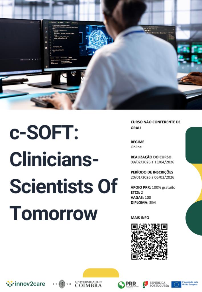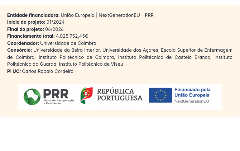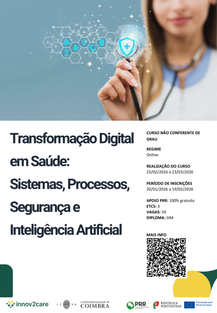 Estes cursos realizam-se no âmbito do Projeto INNOV2CARE – Inovar para Cuidar, financiado pelo Mecanismo de Recuperação e Resiliência da Comissão Europeia, que apoia a modernização da formação e a adequação dos cuidados de saúde, num contexto cada vez mais mediado por ferramentas digitais e tecnológicas.