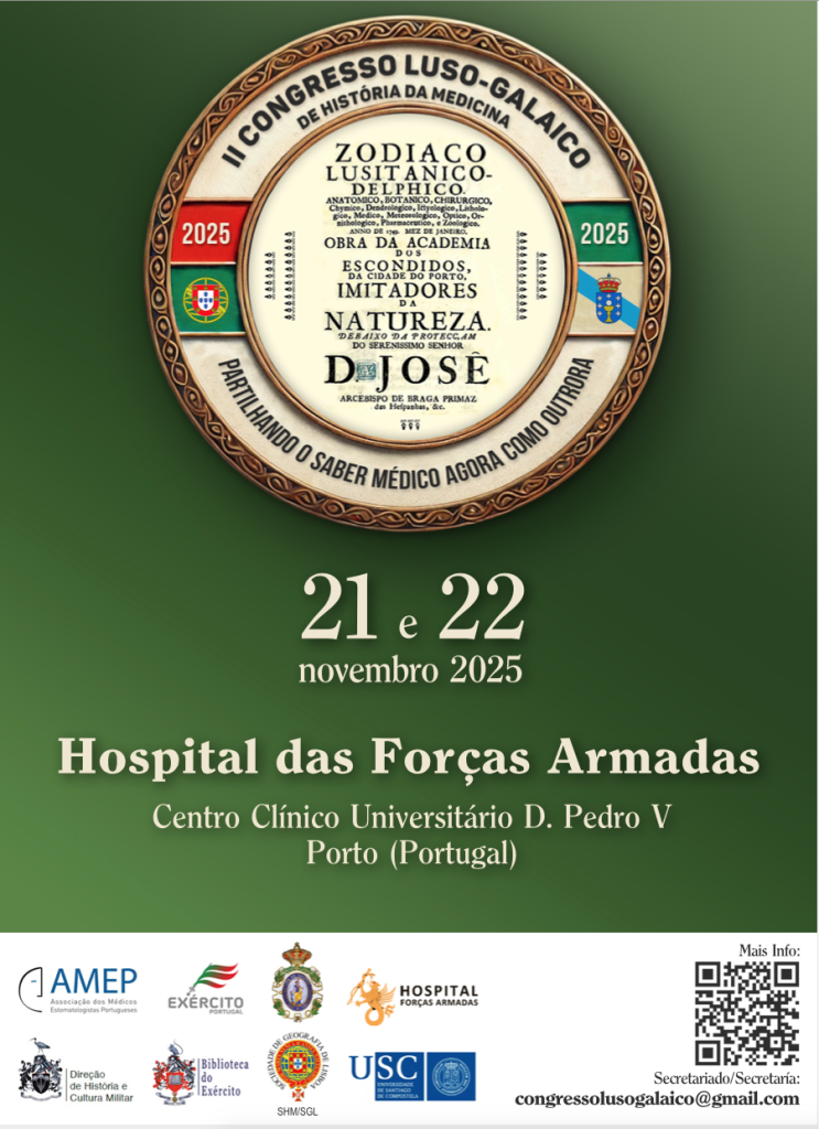 O II Congresso Luso-Galaico de História da Medicina realizar-se-á nos dias 21 e 22 de novembro de 2025, no Salão Nobre do Hospital das Forças Armadas – Centro Clínico Universitário D. Pedro V, no Porto. O evento reunirá investigadores e entusiastas da História da Medicina de Portugal, Espanha e, em particular, da Galiza, acolhendo comunicações, conferências e apresentações diversas (orais, cartazes e gravações áudio-vídeo). Estão abertas as inscrições para este evento que tem como objetivo fomentar o interesse pela história médica e promover um intercâmbio ibérico de saberes.
