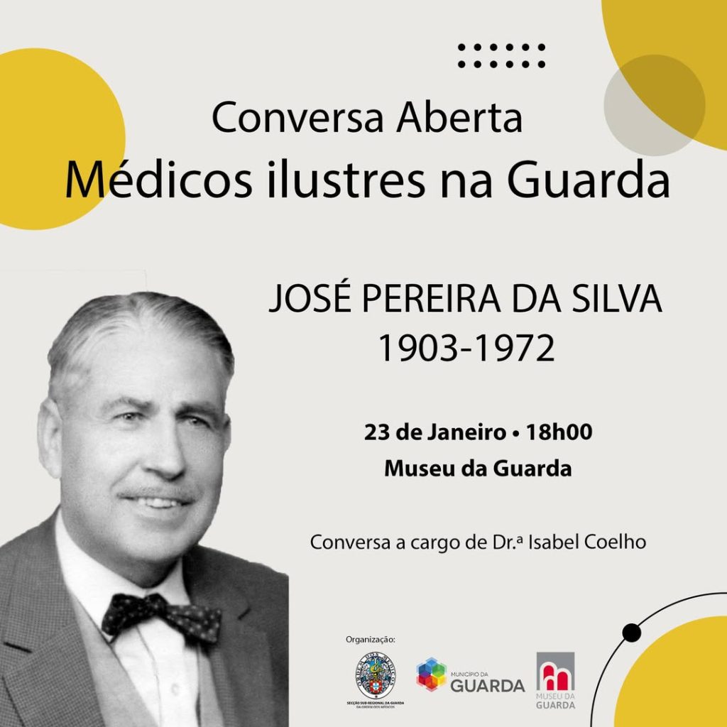 Promovida pela Secção Sub-Regional da Guarda da Ordem dos Médicos (Ordem dos Médicos Guarda) a quinta edição da “Conversa Aberta” sobre Médicos Ilustres na Guarda será dedicada a José Pereira da Silva. Depois de Carolina Beatriz Ângelo, António Maria Sena, Ladislau Patrício, Francisco Sobral, será agora a vez de conhecer a vida e o percurso notável do ilustre médico José Pereira da Silva que nasceu em 18/09/1903 na aldeia de Vila Fernando e morreu em 08/10/1972 na Guarda.