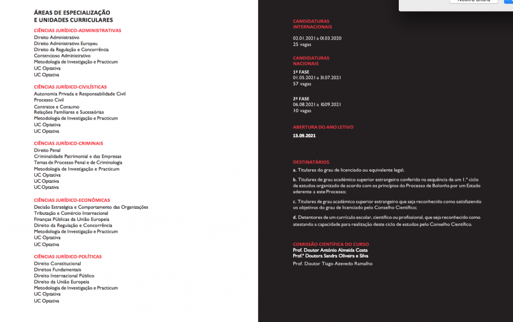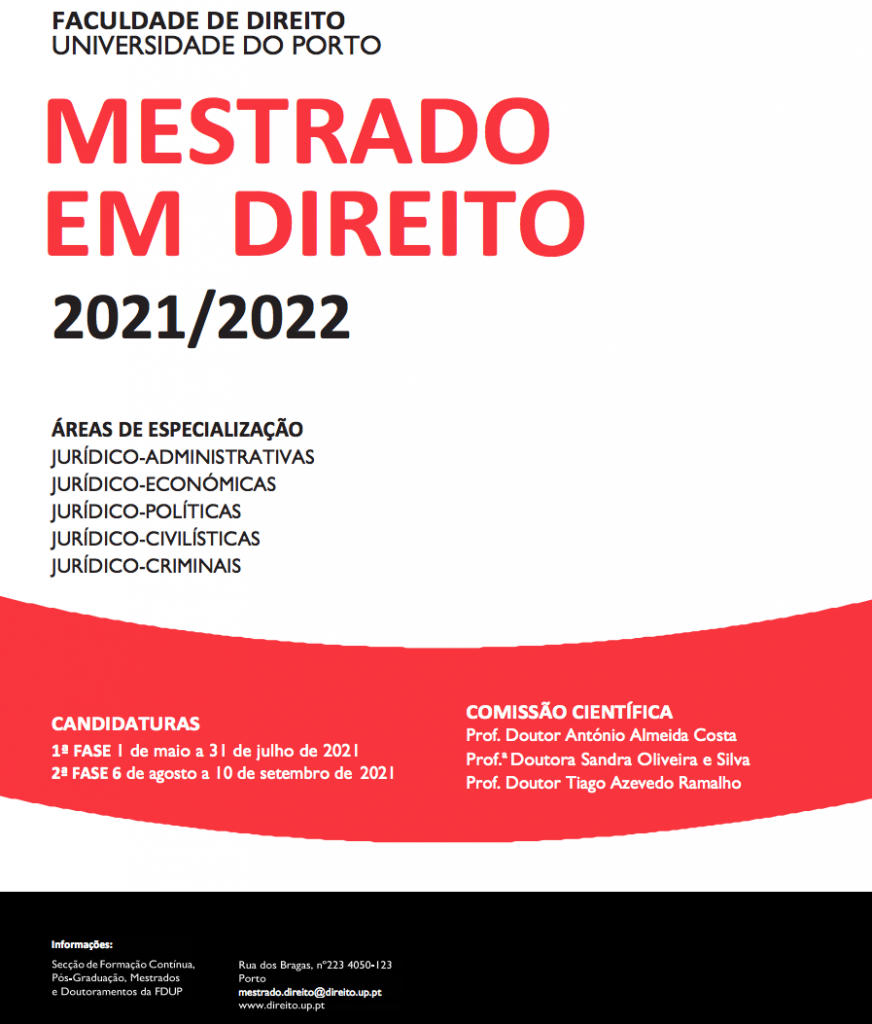 Para mais informações poderão contactar através do e-mail mestrado.direito@direito.up.pt ou poderão consultar a página na internet, disponível em https://s.up.pt/secq