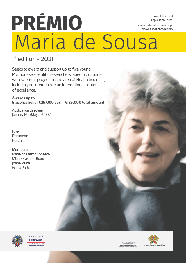 Prémio de Investigação Maria de Sousa: Com o objetivo de homenagear a médica e investigadora Maria de Sousa, contribuindo para a investigação na área das Ciências da Saúde, a Ordem dos Médicos e a Fundação BIAL promovem, em parceria exclusiva, o Prémio Maria de Sousa, que visa galardoar e apoiar jovens investigadores científicos portugueses, até aos 35 anos, em projetos de investigação na área das Ciências da Saúde, incluindo um estágio num centro internacional de excelência.