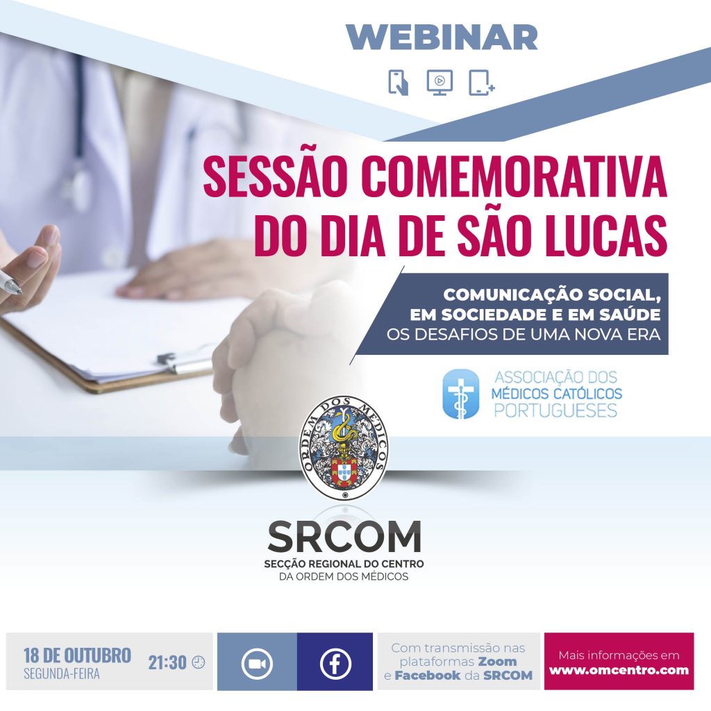 No dia 18 de outubro (segunda-feira), pelas 21h30, decorrerá a sessão comemorativa do Dia de São Lucas, intitulada “Comunicação Social, em Sociedade e em Saúde – os desafios de uma nova era”. A iniciativa, que vai decorrer online, contará com o seguinte programa: