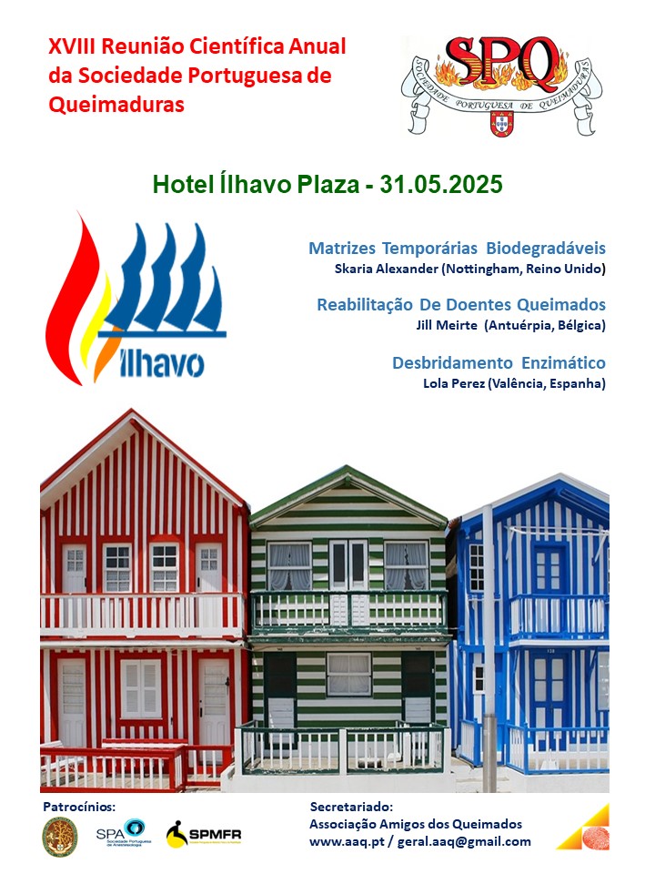 XVIII Reunião Científica Anual da Sociedade Portuguesa de Queimaduras (SPQ), agendada para o dia 31 de maio, tendo lugar no Hotel ílhavo Plaza na acolhedora cidade de Ílhavo. Além da SPQ, esta Reunião, maior encontro de Queimados a realizar este ano em Portugal, conta com o patrocínio oficial da Associação Amigos dos Queimados, da Sociedade Portuguesa de Anestesiologia e da Sociedade Portuguesa de Medicina Física e de Reabilitação. A decisão de realizar este evento fora dos grandes centros urbanos prende-se, mais uma vez com a vontade de descentralizar as atividades da SPQ, tornando-a mais abrangente e inclusiva, para além do atrativo incontornável daquela simpática cidade e suas belíssimas praias, desta forma prestando também uma homenagem a todos os colegas que trabalhando em hospitais que muitas vezes não dispõem das condições necessárias para o internamento dos grandes queimados, têm uma ação fundamental e decisiva para uma adequada abordagem inicial e preparação para o seu encaminhamento para unidades especializadas, assegurando em simultâneo o tratamento das queimaduras de menores dimensões, quer em termos de internamento, quer no ambulatório.