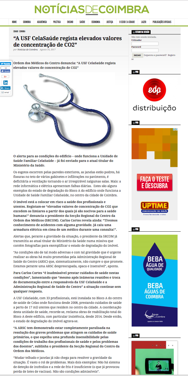 “A USF CelaSaúde regista elevados valores de concentração de CO2”