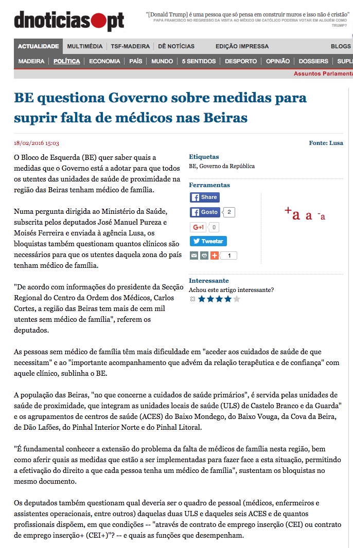 Bloco de Esquerda questiona Governo aobre medidas para suprir falta de médicos nas Beiras