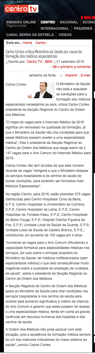 Carlos Cortes critica Ministério da Saúde por causa da formação dos médicos especialistas