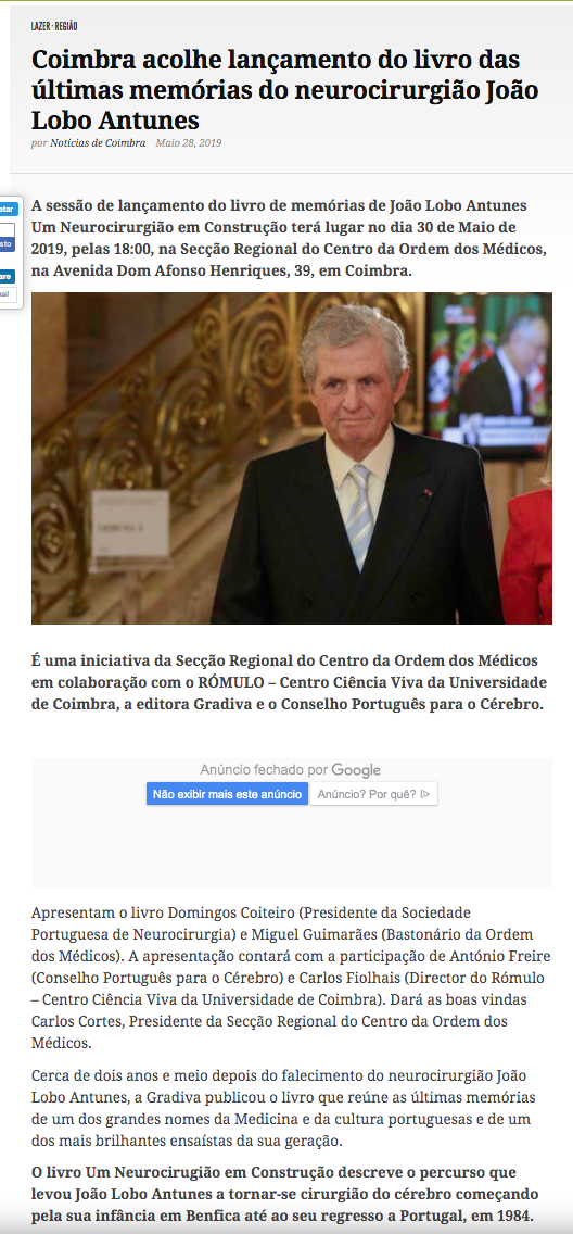 Coimbra acolhe apresentação do livro das ultimas memórias do neurocirurgião João Lobo Antunes