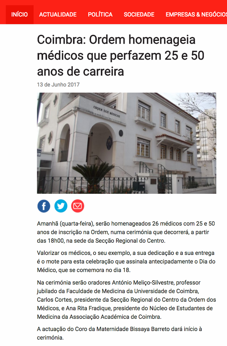 Coimbra: Ordem homenageia médicos que perfazem 25 e 50 anos de carreira