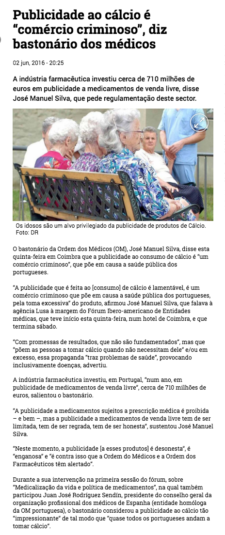 Coimbra: Publicidade ao cálcio é “comércio criminoso”, diz bastonário dos médicos