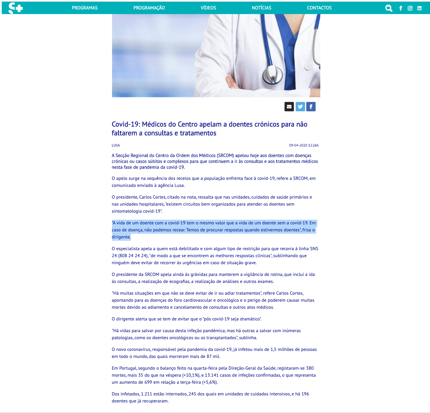 Covid-19 | Médicos do Centro apelam a doentes crónicos para não falharem tratamento e consultas
