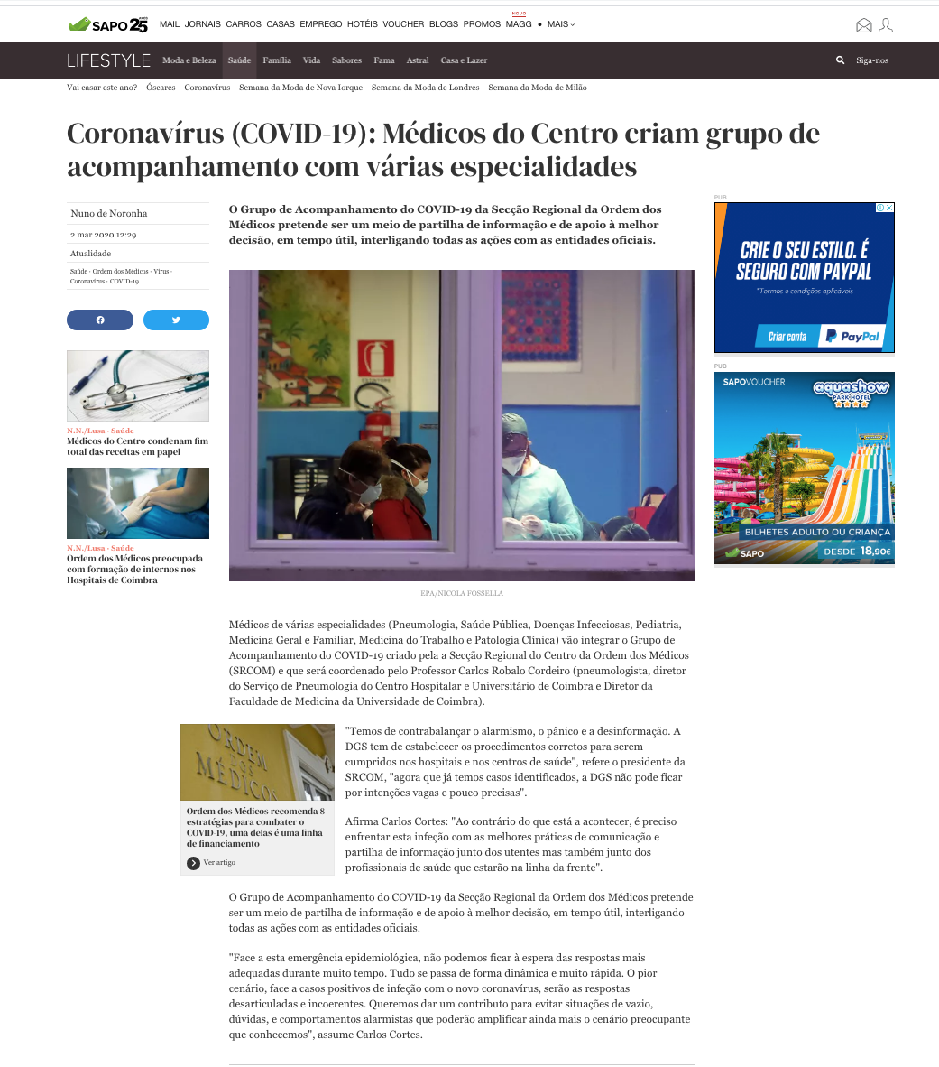 Covid-19 | Médicos do Centro criam grupo de acompanhamento com várias especialidades