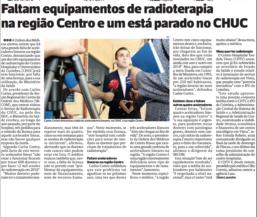 Faltam equipamentos de radioterapia na região Centro e um está parado no CHUC