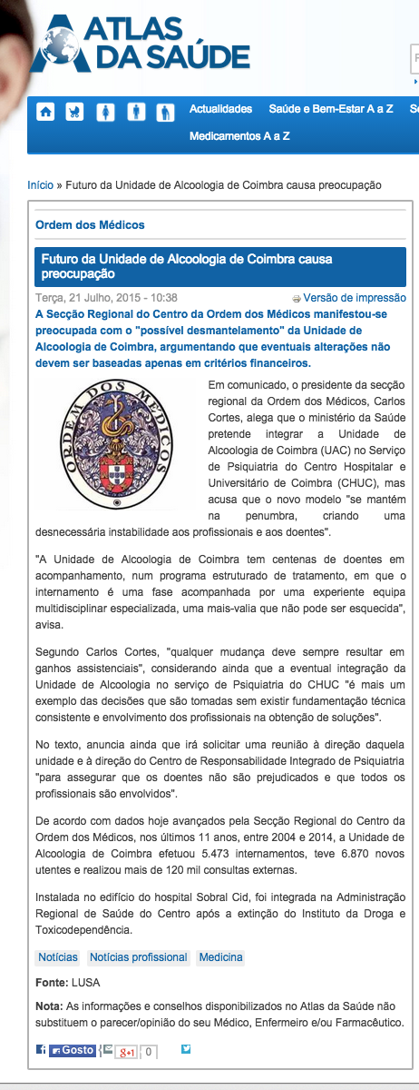 Futuro da Unidade de Alcoologia preocupa secção regional da Ordem dos Médicos