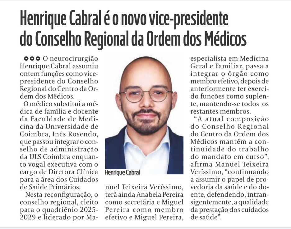 Henrique Cabral é o novo vice-presidente do CRC da Ordem dos Médicos