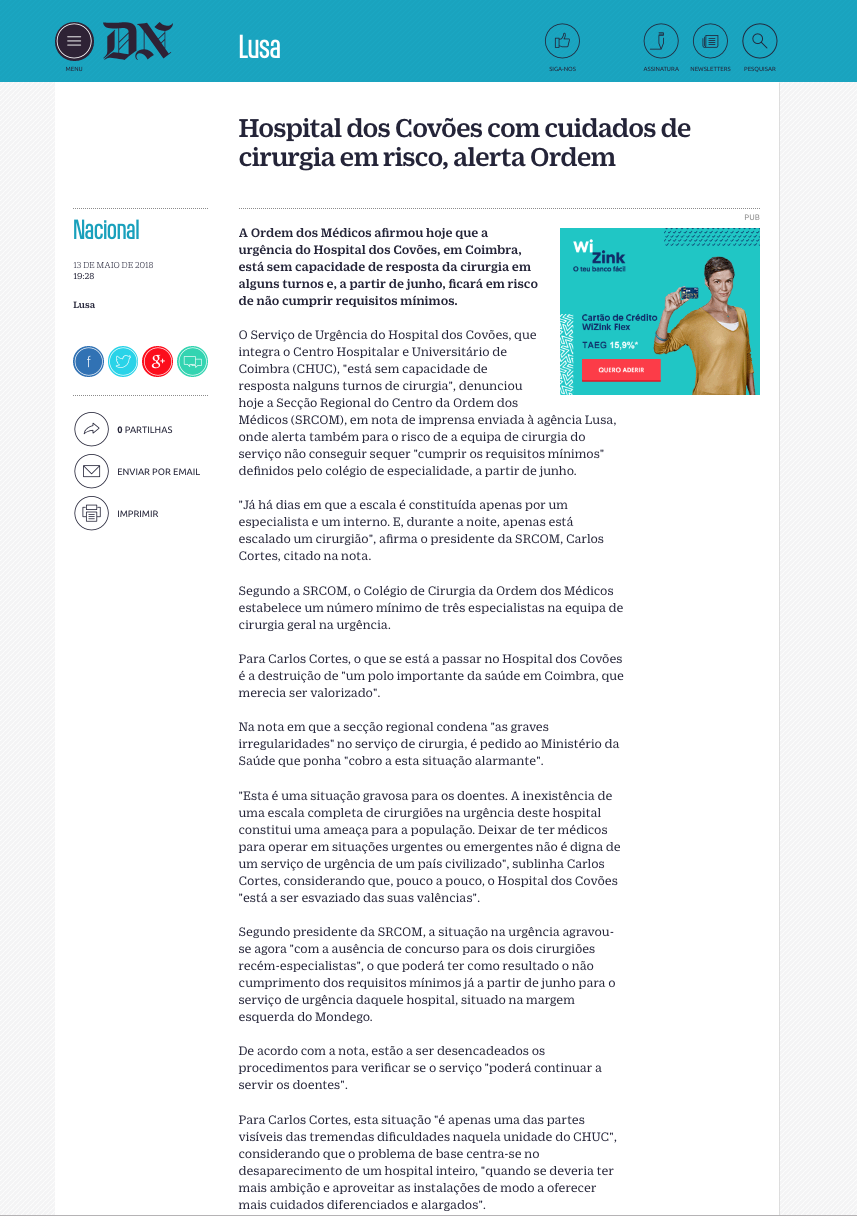 Hospital dos Covões com cuidados de cirurgia em risco, alerta Ordem