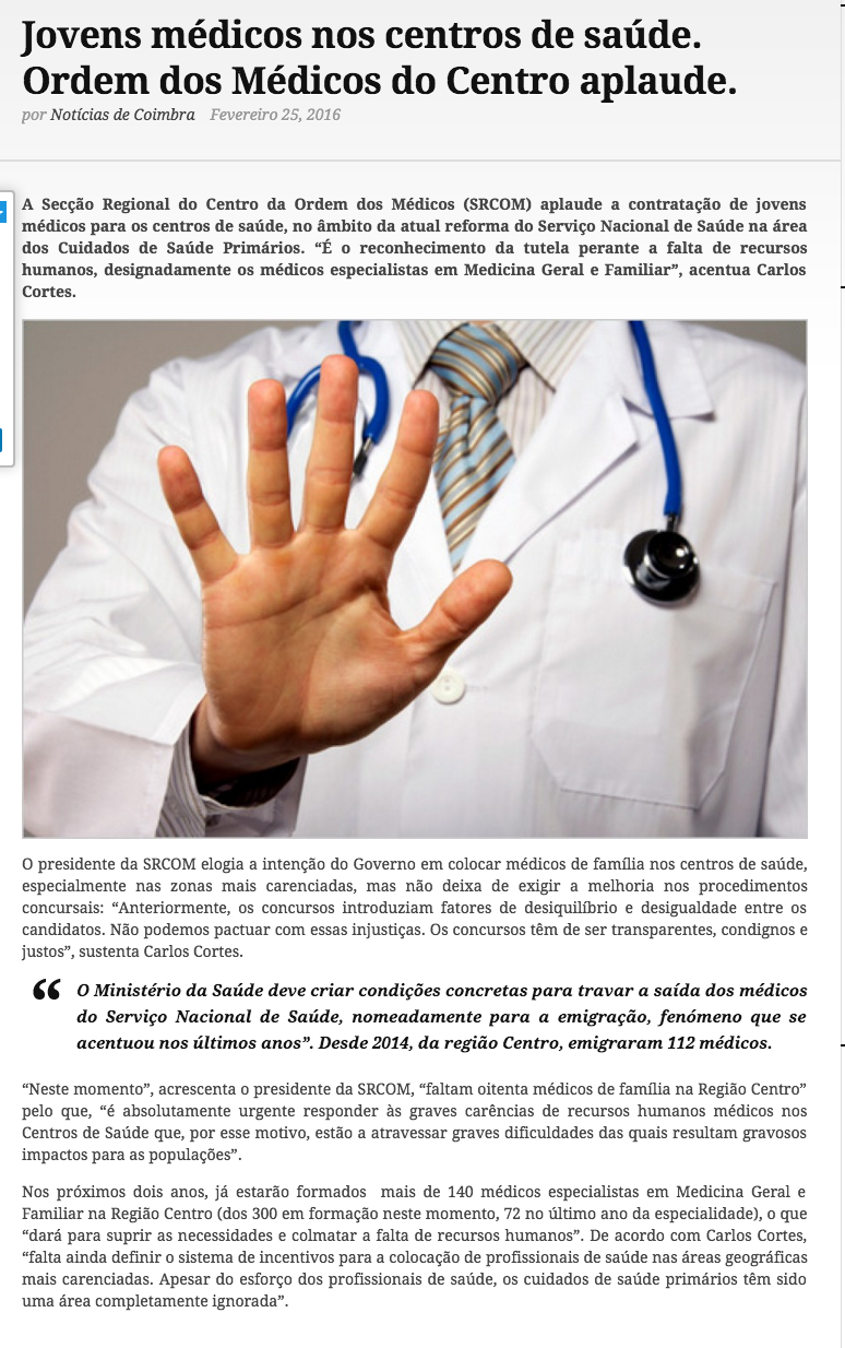 Jovens médicos nos centros de saúde. Ordem dos Médicos do Centro aplaude.