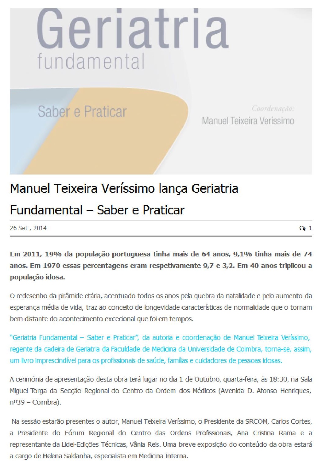 Manuel Teixeira Veríssimo lança Geriatria Fundamental – Saber e Praticar