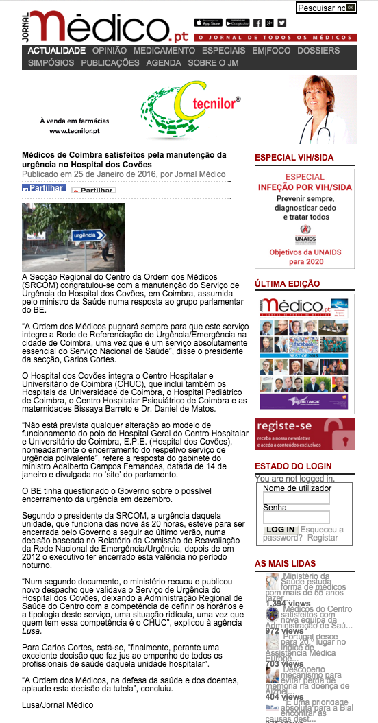 Médicos de Coimbra satisfeitos pela manutenção das urgências no Hospital dos Covões