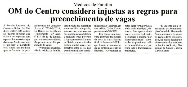 Médicos de Família: OM do Centro considera injustas as regras para preenchimento de vagas