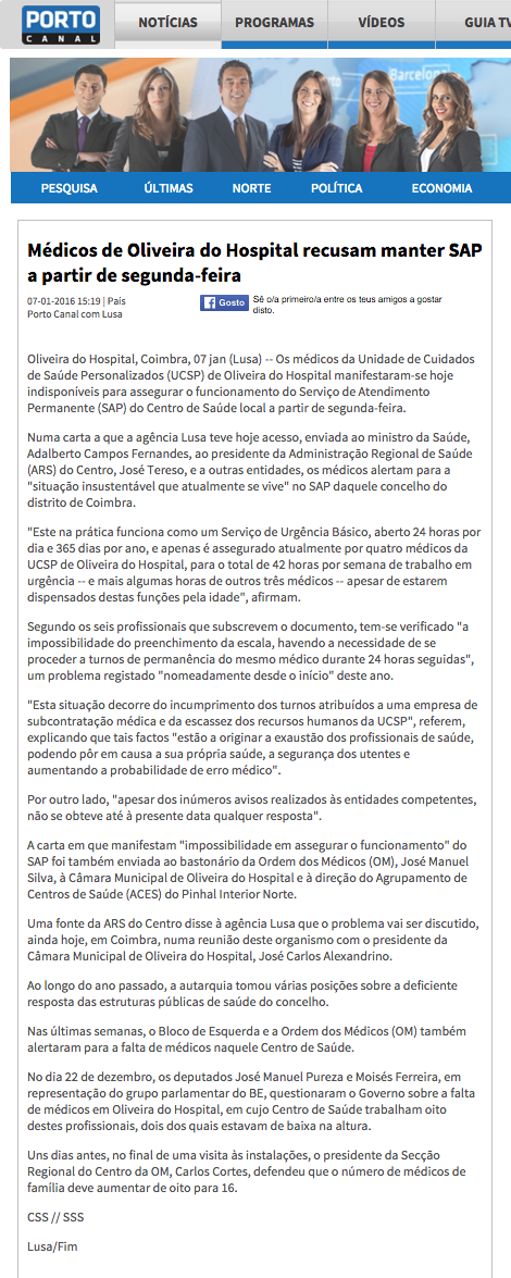 Médicos de Oliveira do Hospital recusam manter SAP a partir de segunda-feira