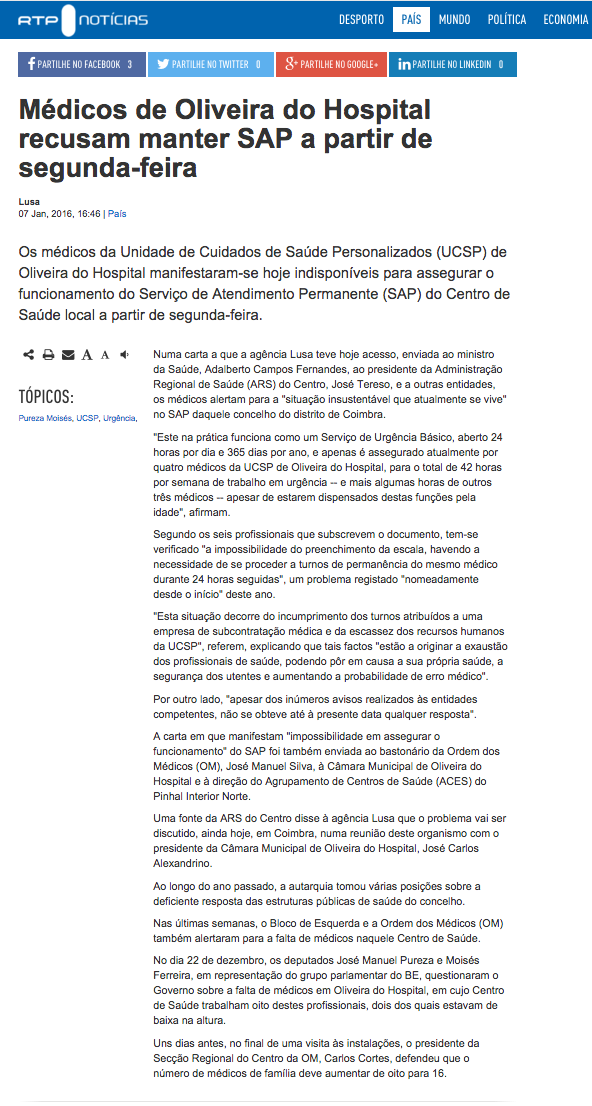 Médicos de Oliveira do Hospital recusam manter SAP a partir de segunda-feira