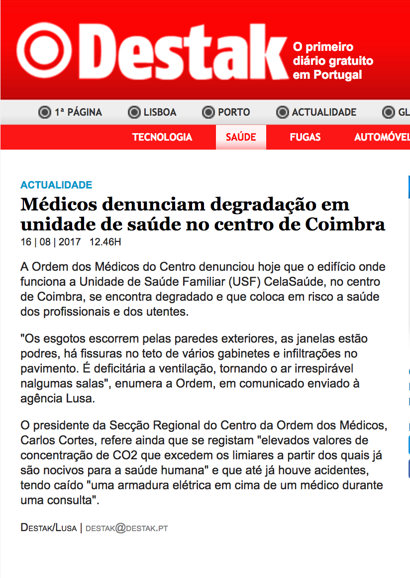 Médicos denunciam degradação em unidade de saúde no centro de Coimbra