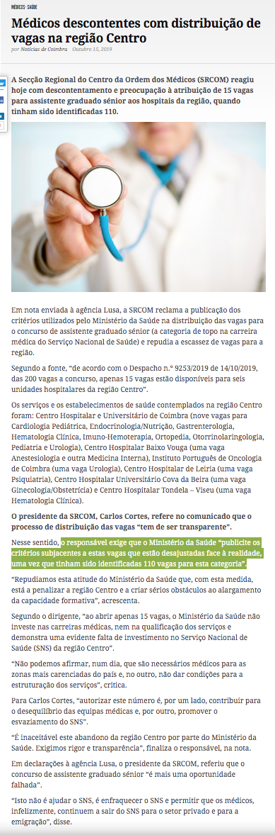 Médicos descontes com distribuição de vagas na região Centro
