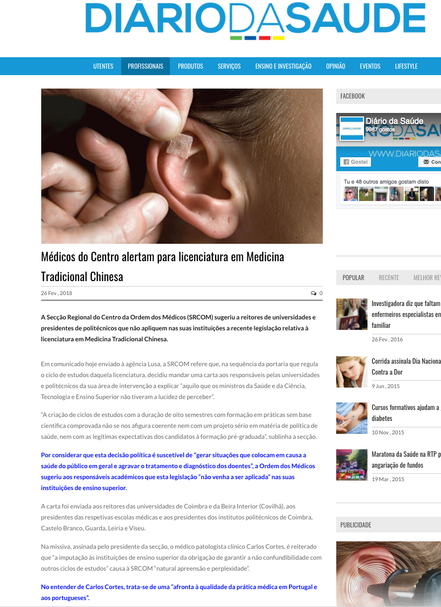 Médicos do Centro alertam para licenciatura em Medicina Tradicional Chinesa