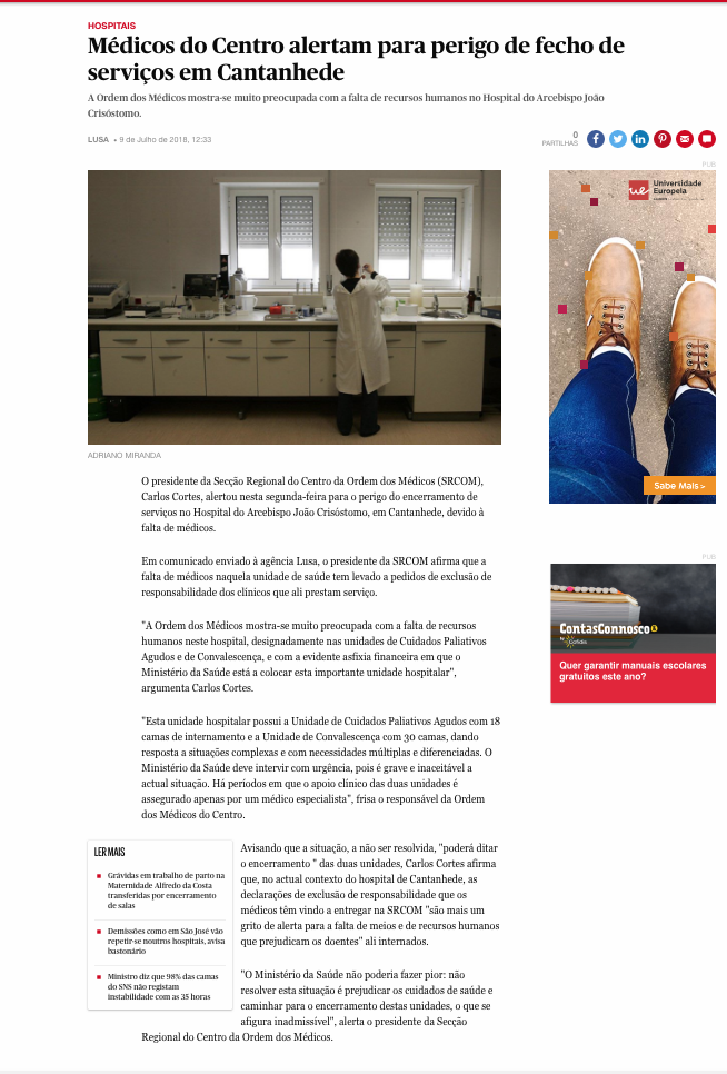 Médicos do Centro alertam para perigo de fecho de serviços de Cantanhede