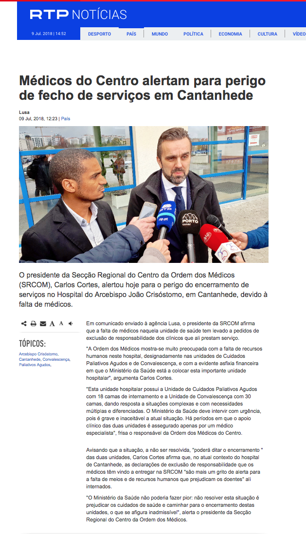 Médicos do Centro alertam para perigo de fecho de serviços em Cantanhede