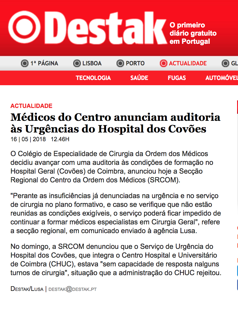 Médicos do Centro anunciam auditoria às Urgências do Hospital dos Covões