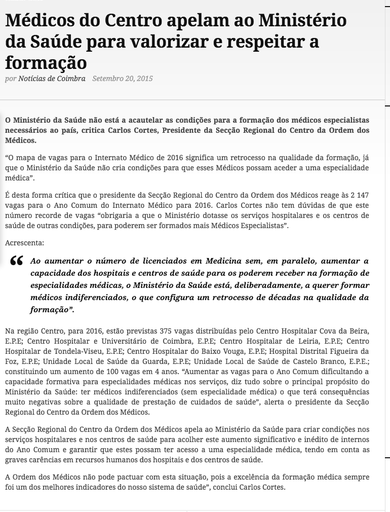 Médicos do Centro apelam ao Ministério da Saúde para valorizar e respeitar a formação