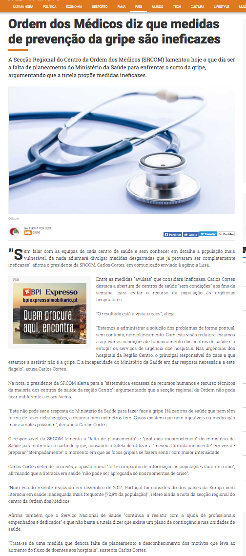Medidas de prevenção da gripe são ineficazes, diz Ordem dos Médicos do Centro