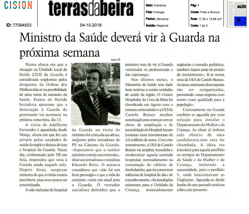 Ministro da Saúde deverá vir à Guarda na próxima semana