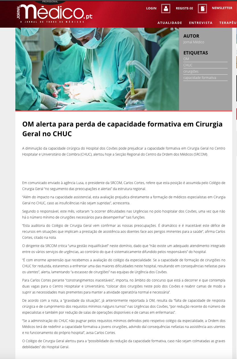OM alerta para perda de capacidade formativa em Cirurgia Geral no CHUC