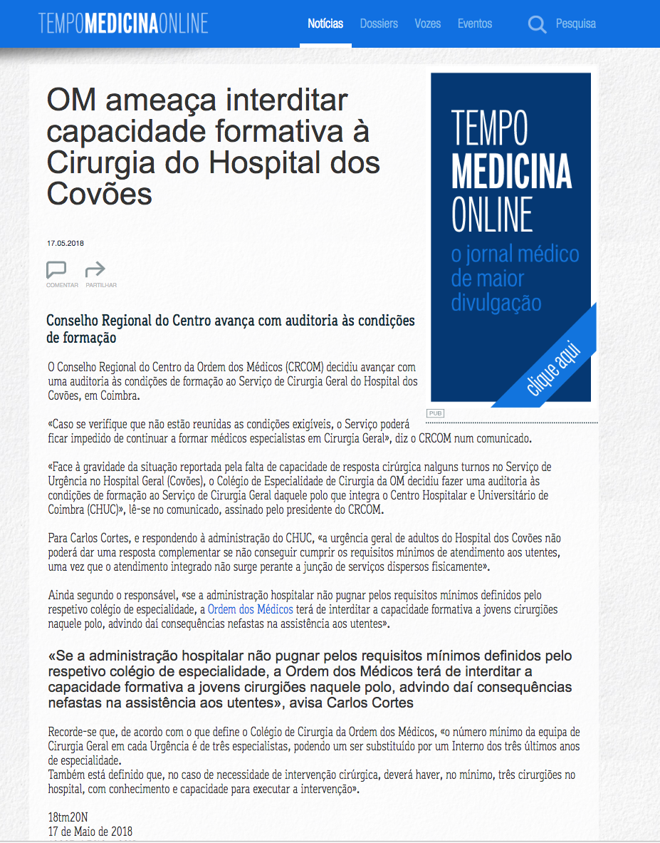 OM ameaça interditar capacidade formativa à Cirurgia do Hospital dos Covões