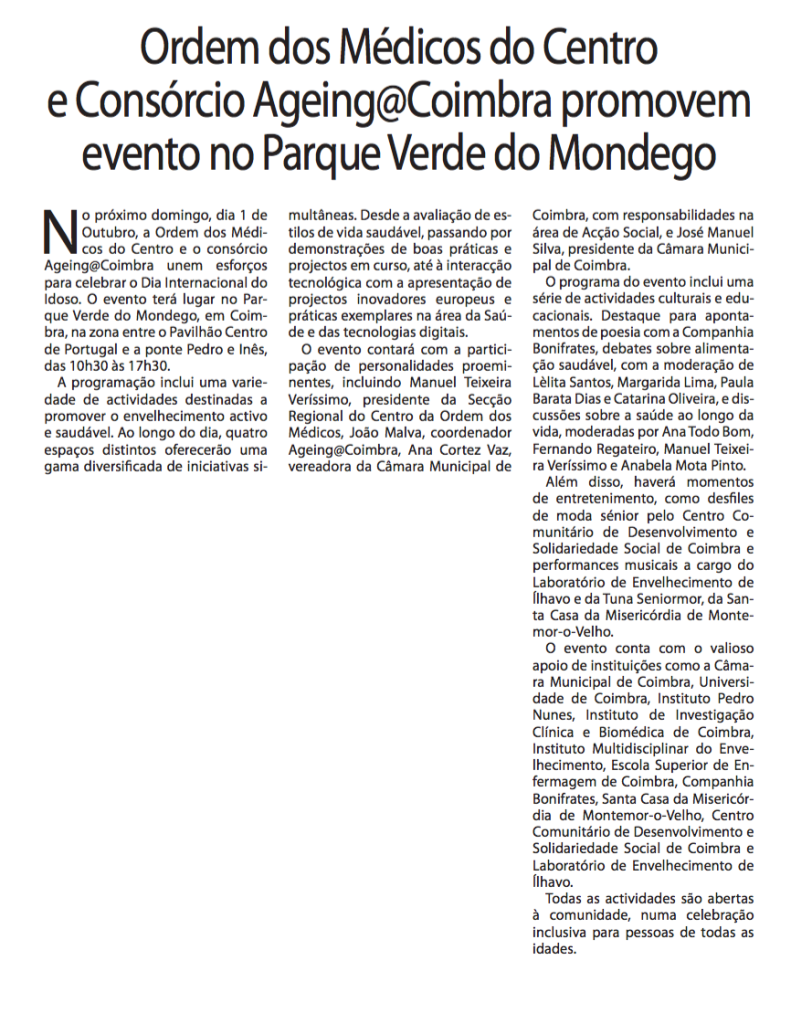 OM Centro e Ageing@Coimbra promovem evento no Parque Verde do Mondego